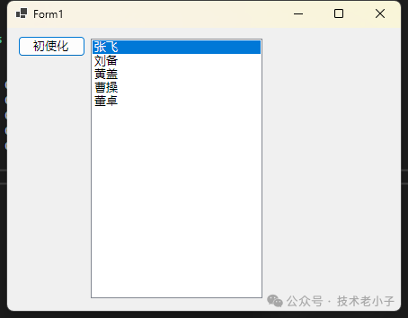 List<User> users = new List<User>();private void btnInit_Click(object sender, EventArgs e){    users.Clear();    users.Add(new User() { Name = "张飞", Age = 24, Country = "蜀" });    users.Add(new User() { Name = "刘备", Age = 24, Country = "蜀" });    users.Add(new User() { Name = "黄盖", Age = 24, Country = "吴" });    users.Add(new User() { Name = "曹操", Age = 24, Country = "魏" });    users.Add(new User() { Name = "董卓", Age = 24, Country = "汉" });    full(users);}