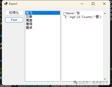 private void btnFind_Click(object sender, EventArgs e){    //默认模式下对HTML敏感字符是不转义的,防止造成WEB安全问题,仅允许UnicodeRanges.BasicLatin的编码,    //需要对中文也转义的话,则需要指定JsonSerializerOptions的Encoder    var option = new JsonSerializerOptions()    {        Encoder = JavaScriptEncoder.UnsafeRelaxedJsonEscaping    };    var lst = users.Find(x => x.Name == "张飞");