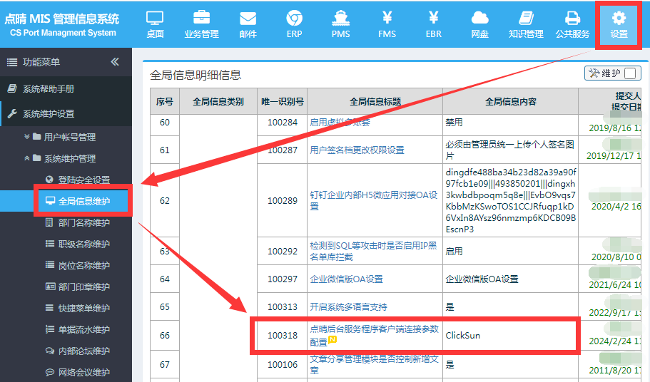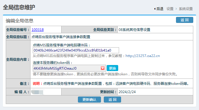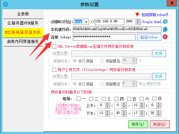 为了确保点晴MIS服务器上的文件被安全备份到远端局域网内的本地电脑上,需要分别在服务器上的点晴MIS后台服务程序和局域网内本地电脑上的点晴MIS系统远程备份程序中保存各自的信息。 打开浏览器,以管理员身份登录点晴MIS系统,打开设置 -》系统维护设置 -》系统维护管理 -》全局信息维护,点击“100318-点晴后台服务程序客户端连接参数配置”: 在远端本地局域网内电脑上,打开点晴MIS系统远程备份程序 -》参数设置 -》MIS系统备份至本机: 将上面的本机硬件码填入上面全局信息维护中的“点晴MIS服务程序客户端电脑硬件码”,然后点击按钮“更新确认”,保存参数到服务器上。 然后服务器端将全局信息维护中的“连接本服务器的token码”复制后填入上面的“连接 token”中,并点击按钮“验证token”,如果能够通过验证则为正确无误。 该文章在 2025/6/12 8:56:23 编辑过 |