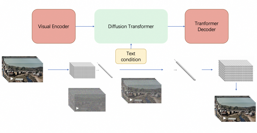 Visual Encoder将视频压缩到较低维的潜在空间(潜在空间这个概念在stable diffusion中用的可谓炉火纯青了,详见此文的第三部分)