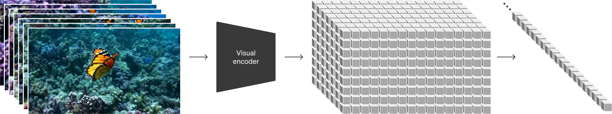 再将这些patches拉平成一个token序列,这个token序列其实就是原始视频的表征:visual token序列
