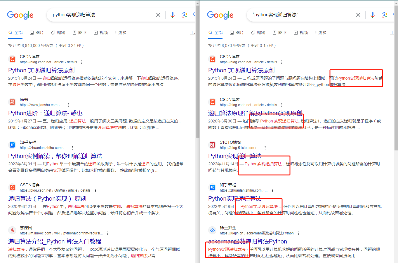 搜索关键字是python实现递归算法,左边是不加双引号,右边是加双引号的效果。