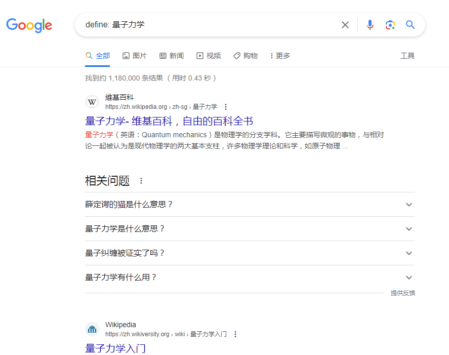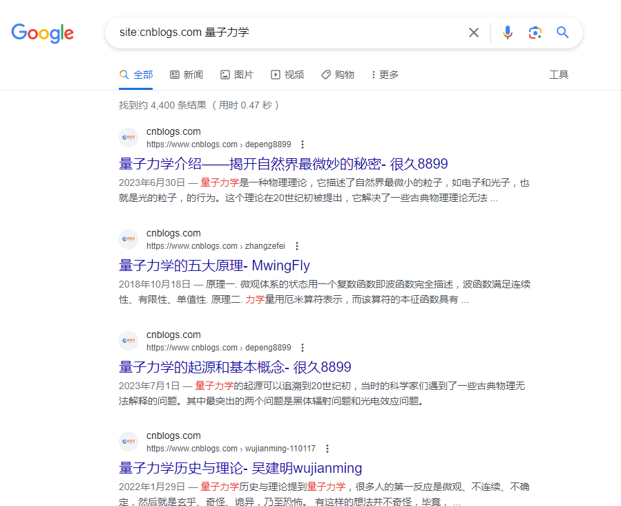 通过site:运算符,指定搜索某个网站,比如下面只搜索博客园中关于量子力学的内容。
