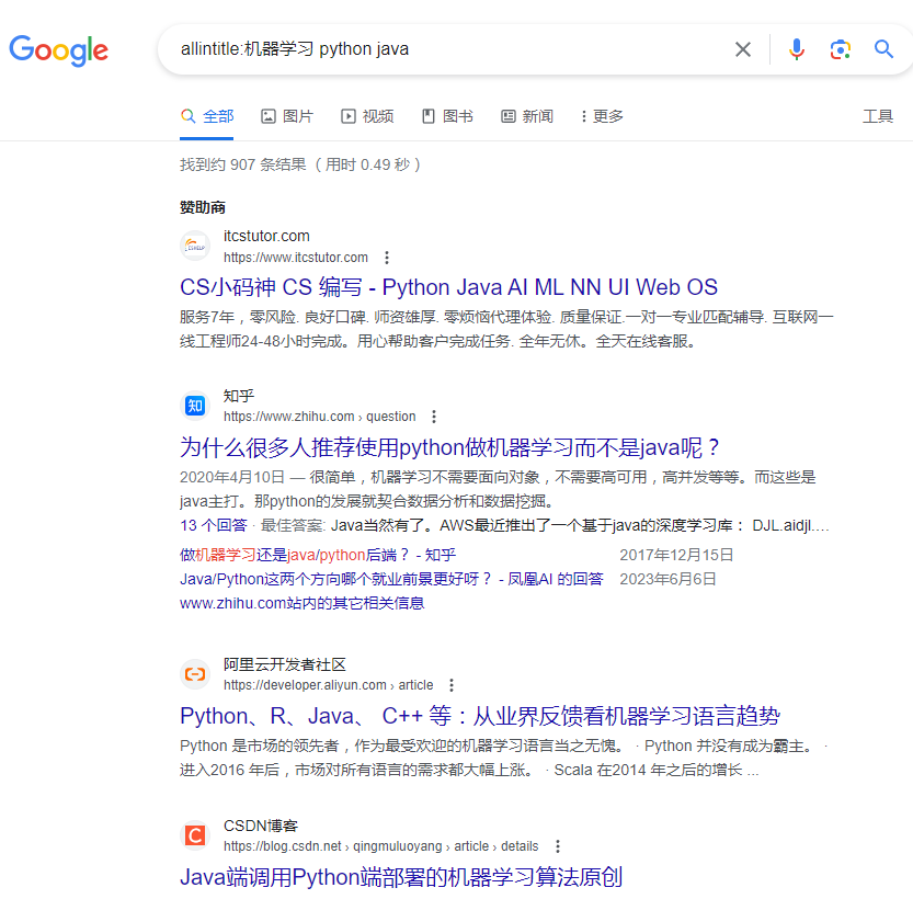 如果需要包含多个关键字,使用 allintitle: 运算符。