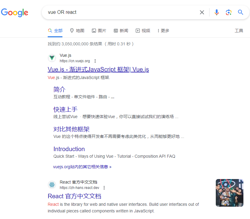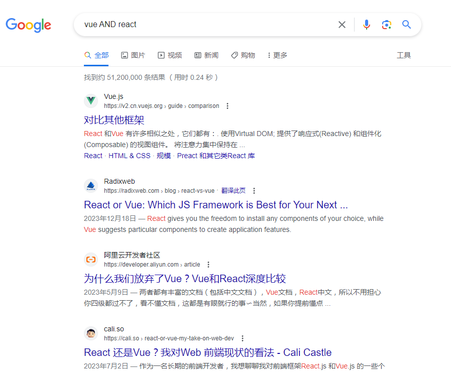 下面的搜索表示,搜索包含vue,但是不包含react的内容。