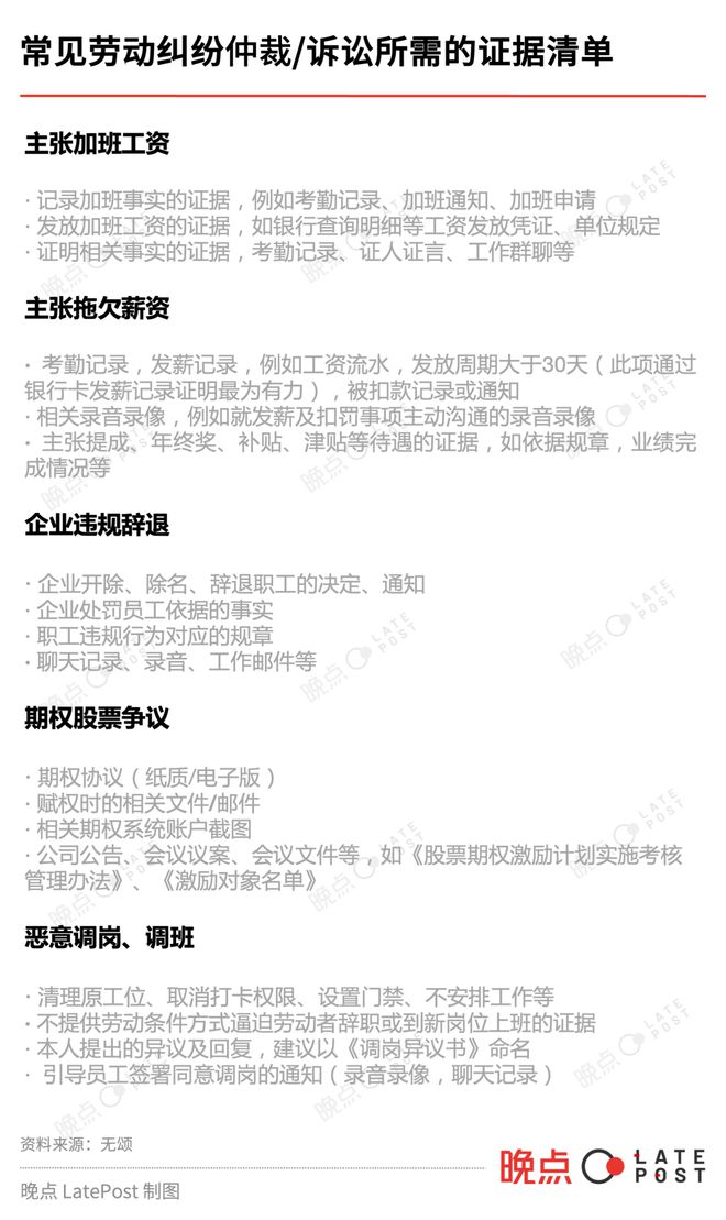 实在没办法的时候,个体怎么和大公司打官司 在一系列自我保护动作失效之后,员工要维护自身权益,可能不得不学习一个新技能 —— 作为个体,如何与大公司打官司。 打官司是一个很复杂的项目,找到一位专业律师,是这场漫长博弈中关键的第一步。而围绕员工劳动权益,专业对口的律师并不如我们想像的那么多,且他们中的多数更愿意站在公司那一边 —— 代理个人的案件投入高,回报低,企业客户能给的收益是数倍甚至更多。 一位为本手册提供了多项专业法律意见的劳动代理律师希望我们不要署名,他愿意为那些遭到不公正待遇的员工代理劳动纠纷案件,但署名可能导致他得罪潜在客户,影响其他需要和公司合作的案件。 走到诉讼,更关键的是员工能够拿出哪些证据。上述律师曾代理过最成功的一起劳动纠纷案件是员工要求公司支付加班费,当事人拿出了过去十年每一次加班的凭据(微信记录、审批记录、工作成果等),累计超过 1000 页证据向公司索赔近 200 万元。最终法院支持了他的主张,实际赔偿金额超过 100 万元。 今天大多数互联网公司员工遇到的情况是,他们在日常工作中往往没有取证意识,离职时也被公司清空了各种数据,一些员工试图在离职后控告公司违反劳动法,但又很难拿出有说服力的证据。 我们并非鼓励员工与公司之间的对立和猜忌,但从众多裁判文书网公布的判决案例和我们了解到的实际纠纷来看,员工在日常工作中养成取证意识是必要的。 日常签署的与自身利益相关的文件,无论纸质还是电子版,都应该第一时间备份。 因为一些已签署的文件可能不会再回到员工手上。一家互联网公司多位员工被告知合同要寄往总部盖章审核。此后,他们没有再拿到已签署的合同,离职后,他们曾多次向公司申请拿回在职期间签署的合同,但都未能拿到。 遭遇公司问话或沟通重要问题时,员工全程录音也有其必要,作用是证明当时双方都说过什么。以加班为例,员工需要保存的证据包括但不限于加班当日的沟通记录、明确的工作任务、实际完成的工作成果、上下班打卡记录和离开公司时带有明确时间戳的照片或视频等。 劳动仲裁 / 诉讼中,员工可以提供的证据清单包括但不限于物证(如工牌、办公设备、存有文件的 U 盘)、书证(劳动合同、解除劳动合同通知书、员工手册、考勤绩效表、工资单等)、音像资料(录音、录像)以及电子数据(工作聊天记录、工作邮件、短信等)。 需要强调,任何劳动纠纷诉讼,员工必须要拿出充分、具体的证据,仅凭员工自述或一部分聊天沟通记录,不足以让法庭支持其主张。另外,员工在劳动仲裁时准备的证据,也可能会在后续一审、二审中使用,应及时做好备份,为后续诉讼节省时间。 接下来,员工还需要了解仲裁和诉讼的流程,提前做好准备。这意味着员工需要从零开始学习一套新的经验,这足够让人身心俱疲。 根据法律规定,中国劳动争议案件处理流程一般为 “一裁两审”,即先申请劳动仲裁,对裁决不服的,提起一审和二审诉讼程序。除去有公司欠付劳动报酬的书证可以直接向法院起诉,大多数劳动纠纷都需要从仲裁开始。 多数情况下,劳动仲裁的时效通常为员工知道或应当知道权益受到损害之日起 1 年,员工可以向工作地或者公司注册地的劳动仲裁委员会提起仲裁,需要准备的材料包括但不限于仲裁申请书、身份证明、劳动关系证明和相关证据。 劳动仲裁准备期间,当事人应及时向仲裁庭和律师沟通,了解所需提交的证据,避免出现证据疏漏,以及在每个需要的环节到场配合。在仲裁全程,仲裁庭通常会根据案件情况主张双方和解。如未能达成和解,裁决结果通常会在申请受理后 45 天 - 60 天内下发。 如果当事人或者公司对仲裁结果不满意,可以提起诉讼,在收到仲裁裁决书之日起 15 天内可向人民法院提起诉讼。 进入法院庭审,对于劳动争议案件,多数地方法院都会遵循 “类案类判” 原则,即对于相同类型的案件,法院或者法官会给出与过去裁判结果相同或类似的判决结果。这也是多数劳动者在竞业等诉讼中败诉的重要原因。 当事人如果想要跳出这一循环,往往需要补充更多有效证据或与律师商议准备工作,就案件特殊性,从案件一审开始,就要求法院对案情重新作全面审查,重新调查取证。这在很大程度上取决于劳动者前期自我保护时获得的各类证据的丰富程度。 需要强调的是,当一个普通员工面对和公司的诉讼,无论是作为原告还是被告,个体的力量都是渺小无力的。上诉律师曾经代理的一个劳动纠纷案件,从劳动仲裁到案件二审用时四年零六个月。在案件结束后,当事公司动用关系撤销了该案所有判决书在网络上的留存记录。 员工们面对的是一个比自身强大数倍的对手,公司有着经验丰富的法务及律师团队,充足的时间和资源,一些大公司凭借其贡献的税收和就业在地方积累了一定的影响力,这意味着员工即便有正当理由和证据,想要打赢官司也并不容易。 一家电商平台前员工曾在与公司的诉讼中遇到法官在庭后调解,劝他接受自己败诉,不要再次上诉。这位法官告诉他,“我们理解你的困难,但以前同类的案子都是这么判的,如果给你不同的判决结果,那以前的案子该怎么办?” 但依然有人坚持把官司继续打下去,函道与公司的官司从仲裁打到了终审,在终审判决前,公司提出了调解,如果他接受调解结果,则赔