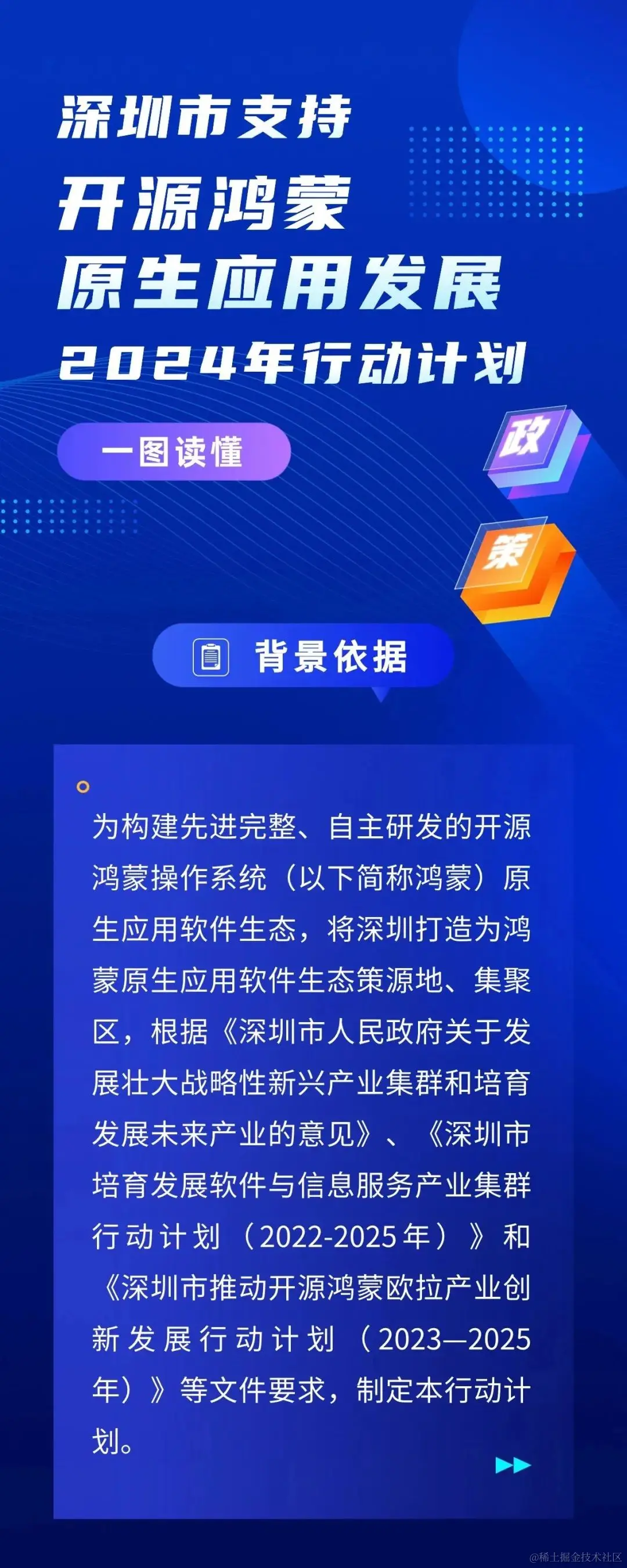 导读 3月3日上午 10 点,有一篇关于鸿蒙技术发展的重要文章发布《深圳市支持开源鸿蒙原生应用发展2024年行动计划》。 鸿蒙技术的不同态度华为鸿蒙系统自提出以来,网友们的态度各不相同,有嘲笑“安卓套壳”的,也有认可自主操作系统价值的,更有很多“尝螃蟹”的人开始学习并分享。 之所以态度不同,根本上是因为屁股坐的位置不同。 那些开始学习并分享的,除去部分有远见者,大多数是因为公司处于行业头部,华为有主动沟通对接,需要在正式上线前做好鸿蒙版 APP。工作上需要使用,那学习也就自然而然了。 而那些持观望态度、犹豫要不要学的,主要是因为工作上用不到,不确定学习鸿蒙技术有没有前景,值不值得投入时间。 重要方向已经明确在今天以前,“鸿蒙技术是否有前景”还没有明确的信号,网络上看到的都是网友的主观判断。 但今天(2024.03.03)不同了。 上午十点,深圳发布公众号发布了一篇文章:#《深圳市支持开源鸿蒙原生应用发展2024年行动计划》印发。 这篇文章很长,主要讲了这么几点: