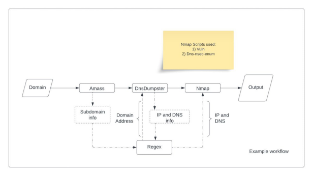 因此,基于以上所述,假设我们需要获取子域名地址,然后提取IP地址,最后利用Nmap进行基于脚本的漏洞分析。以下是整个流程的大致步骤: