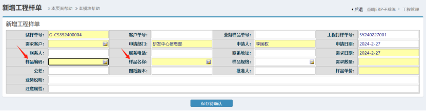 填写上所需要的信息然后点击保存待确认即可 补充说明:如果不需要转生产的样品样,只是打样单用于试验的,编码名称可以手填(任意) 但如果要转生产的话,必须有基础资料才行,所以新增样品单的编码通过点击选择 点晴模切ERP更多信息:http://moqie.clicksun.cn,联系电话:4001861886 该文章在 2024/2/27 14:53:20 编辑过 |