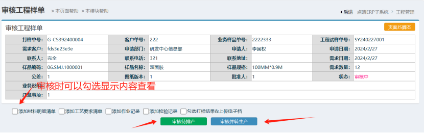 :点晴ERP-样品交货提醒单审核操作![]() 点击进入 如下图: ![]() 点中要审核的一条明细,然后点击审核按钮 如下图: 审核待排产:点击提交会在排产界面增加此样品的排产内容 审核并生产:点击提交会直接生成生产工单,无需排产 补充说明:要转生产的话,前提是已经新建了该编码的基础资料