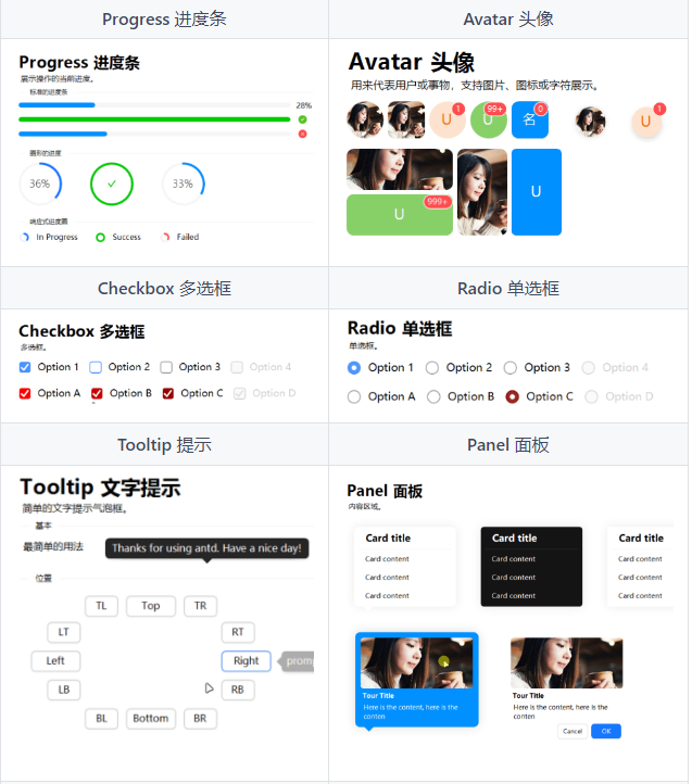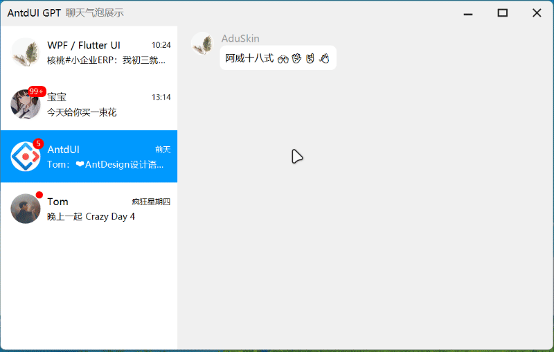 聊天界面 使用 AntdUI 构建的聊天界面 ![]() 控件列表 控件列表非常丰富,包含了大部分常用的组件,在项目中集成后可以按需使用。 ![]() ![]() ![]() 该文章在 2024/2/27 18:41:06 编辑过 |