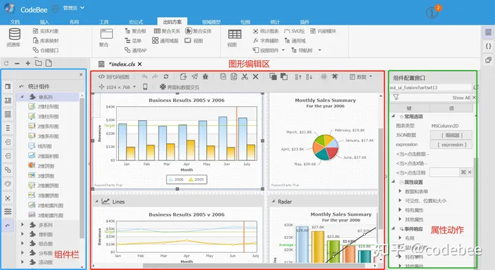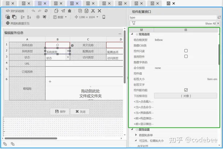 在主体布局上默认采用的表格布局,支持行列的自由拖动,以及行列合并操作。