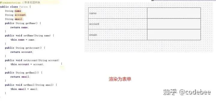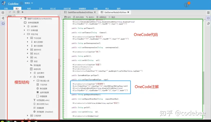 OneCode 本身基于JAVA语言体系,是在Java Spring 注解基础上的一套扩展子集,混合编译引擎器通过扩展注解构建完整的Domain模型,通过读取标准Spring 注解完成普通Web数据交付及调度过程,通过Domin域模型动态渲染JS文件输出为JSON交付给前端引擎构建页面。