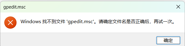 根据网上的教程(https://baijiahao.baidu.com/s?id=1765612450796507368&wfr=spider&for=pc),输入gpedit.msc,准备调整组策略,会提示“window 找不到文件‘gpedit.msc’。请确定文件名是否正确后,再试一次。