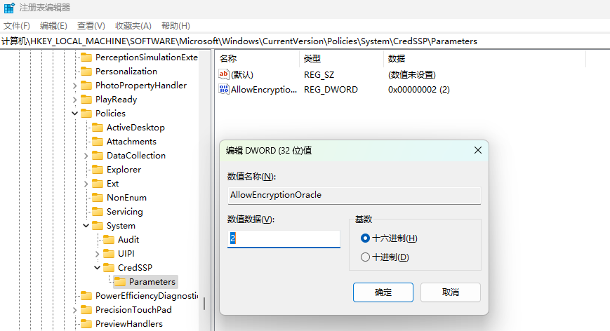 5、在Parameters 里(右侧) 单击右键,新建—> DWORD(32位),重命名为:“AllowEncryptionOracle",值:2