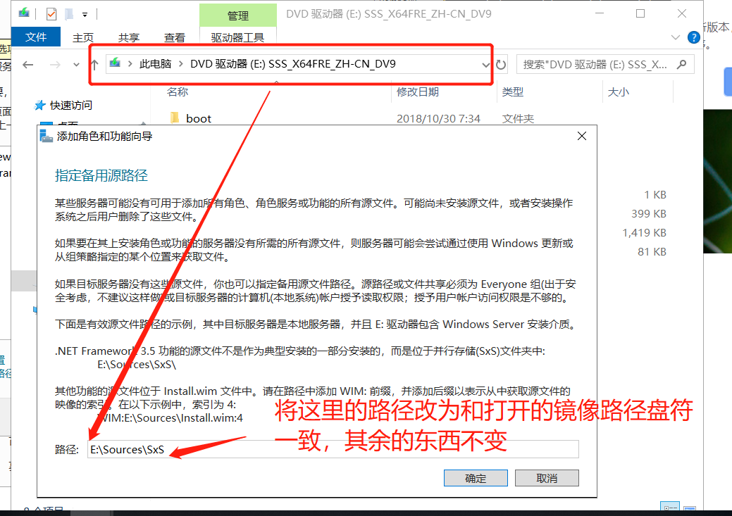 将路径的盘符设置为打开的镜像的位置盘符保持一致,我这里是打开为E盘,所以设置为:E:\Sources\SxS,然后点击“确定”。 注意:只用改盘符就行了,其他的路径保持不变,即\Sources\SxS保持不变。