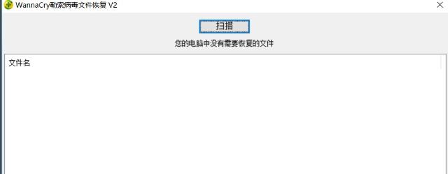 ![]() 当完成了WananCry勒索病毒文件恢复工具后,将弹出如图所示的窗口,在此直接点击“扫描”按钮,以便对电脑中被勒索病毒感染而加密的文件进行恢复操作。