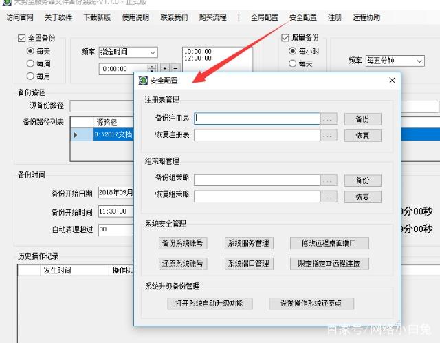 ![]() 在如图所示的“安全配置”界面中,大势至服务器文件备份系统可以针对“注册表”、“组策略”进行备份及恢复操作,还可以对“系统账户”、“系统服务”、“远程桌面端口”等系统安全项进行有效管理。