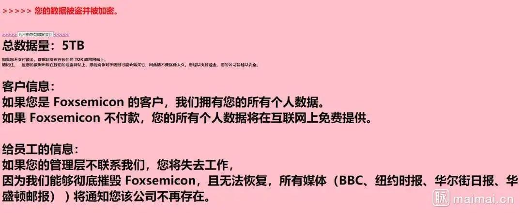 上市芯企:不付钱5TB客户资料将被公布 知名ToB技术社区:qidao123.com报道:鸿海集团旗下半导体设备大厂京鼎遭黑客入侵,黑客集团更直接在网站上威胁京鼎客户与员工,如果京鼎不支付赎金,客户资料将会被公开,员工也将因此失去工作。 报道指出,黑客集团在窃取资料后直接挟持上市公司网站,昭告天下该公司内部资料被窃,这是全台湾第一次。据悉,京鼎是鸿海集团旗下子公司,主要经营半导体前段制程设备关键模组、半导体自动化设备研发,是台湾重要的半导体上市公司,其最大客户为全球半导体设备龙头应用材料,营收占比达8至9成。