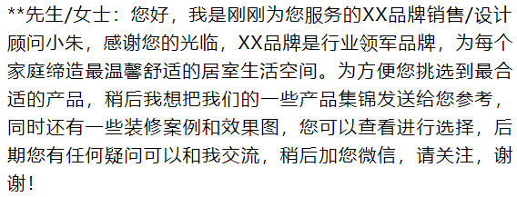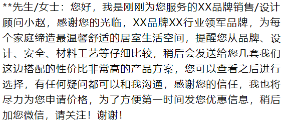一、没占到便宜、嫌价格贵的客户 **先生/女士:您好,我是刚刚为您服务的XX品牌销售/设计顾问小谢,感谢您的光临,XX品牌是行业领军品牌,装饰生活,装扮梦想,宁愿为价格解释一阵子,也不愿意为质量道歉一辈子,感谢您的信任,我也将为您提供最优质的服务,为更好沟通稍后加您微信,请关注!谢谢! 二、刚逛,在比较的客户 **先生/女士:您好,我是刚刚为您服务的XX品牌销售/设计顾问小李,感谢您的光临,XX品牌是行业领军品牌,为每个家庭缔造最温馨舒适的居室生活空间。为选到最好的产品,建议您从品牌、设计、安全、材料工艺等方面仔细比较,后期您有任何装修疑问也可以互相交流,稍后我加您微信,把您喜欢的产品图片发您参考,请关注,谢谢! 三、回去商量的客户 **先生/女士:您好,我是刚刚为您服务的XX品牌销售/设计顾问小王,感谢您的光临,为方便您与家人沟通,稍后想把您喜欢的产品图片、实景效果图等资料发您,后期您有任何装修疑问也可以互相交流。稍后加您微信,请关注,谢谢! 四、没挑选到合适产品的客户 五、超预算的客户 注意 该文章在 2024/3/9 12:06:09 编辑过 |