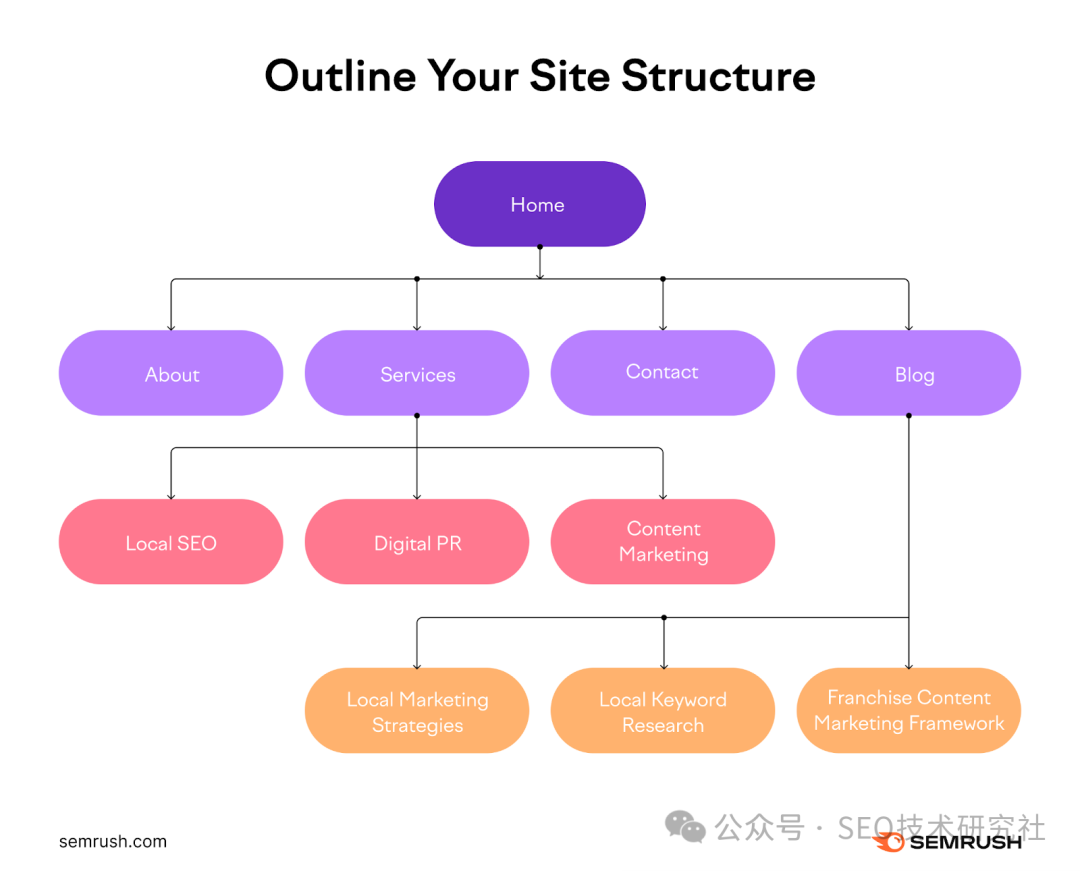 选择一个简洁有效的域名可能需要认真的时间和思考。但这是值得的。 2. 概述您的网站结构和架构网站结构是您组织和链接网页的方式。这对用户体验很重要。以及一种为您的新网站提高 SEO 的方法。 以下是拥有坚实网站结构的主要好处: