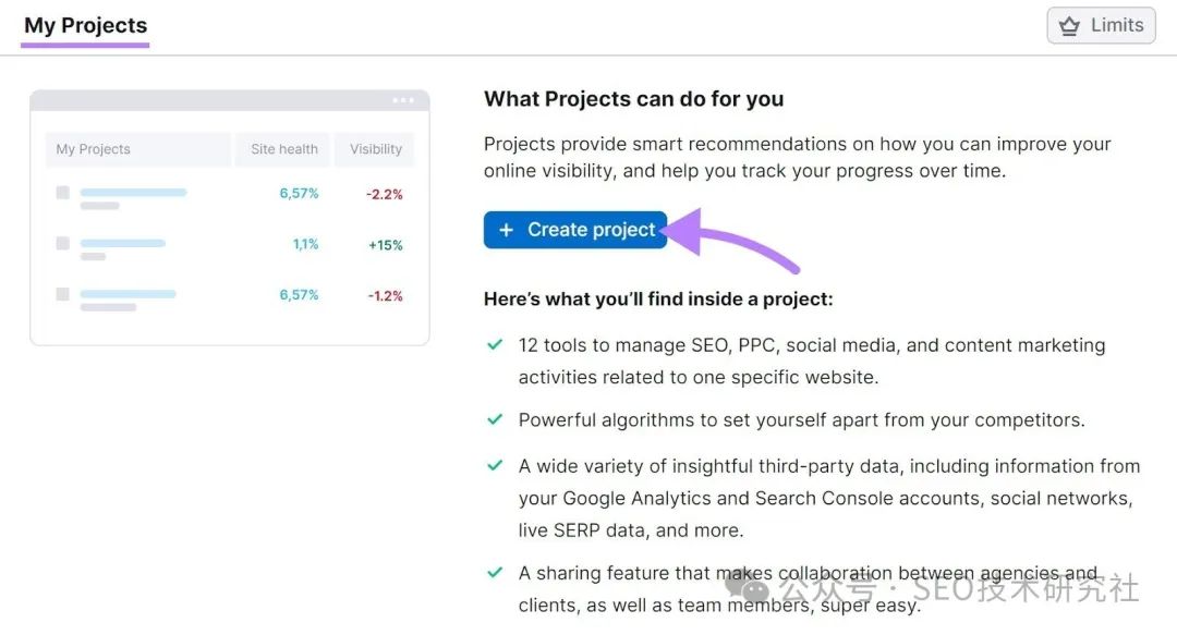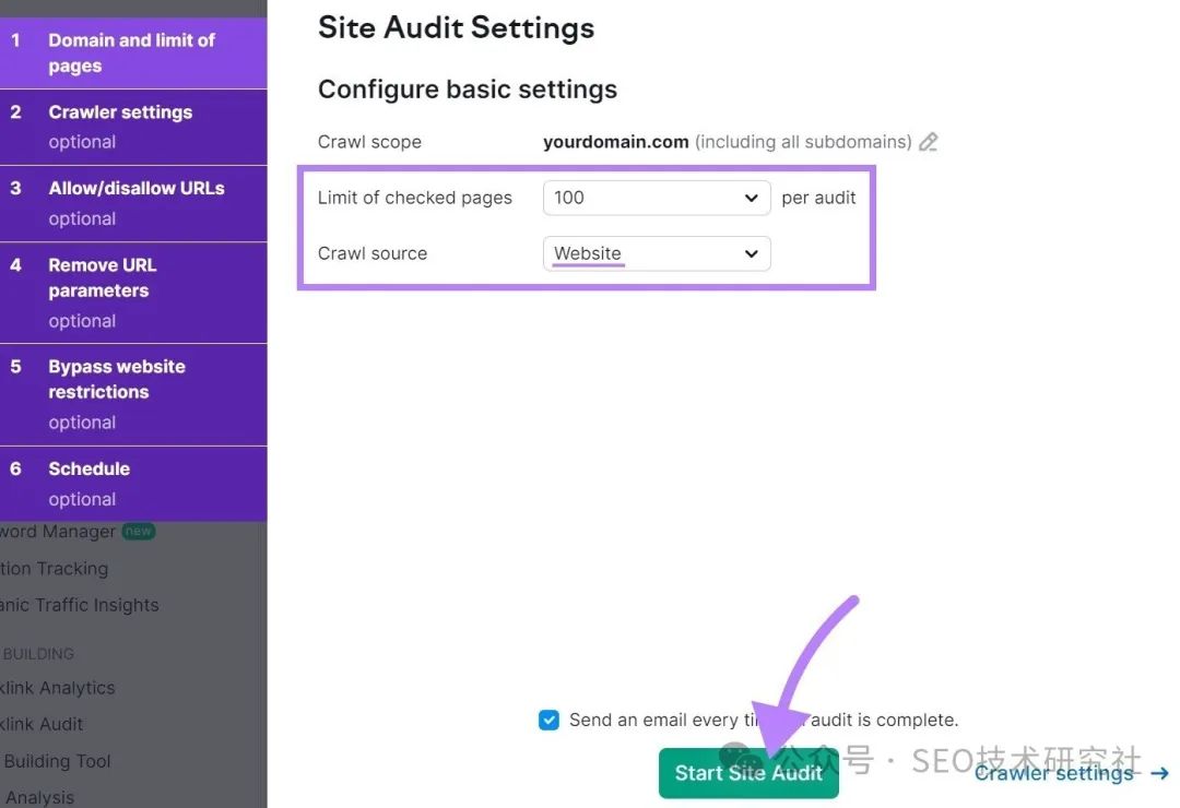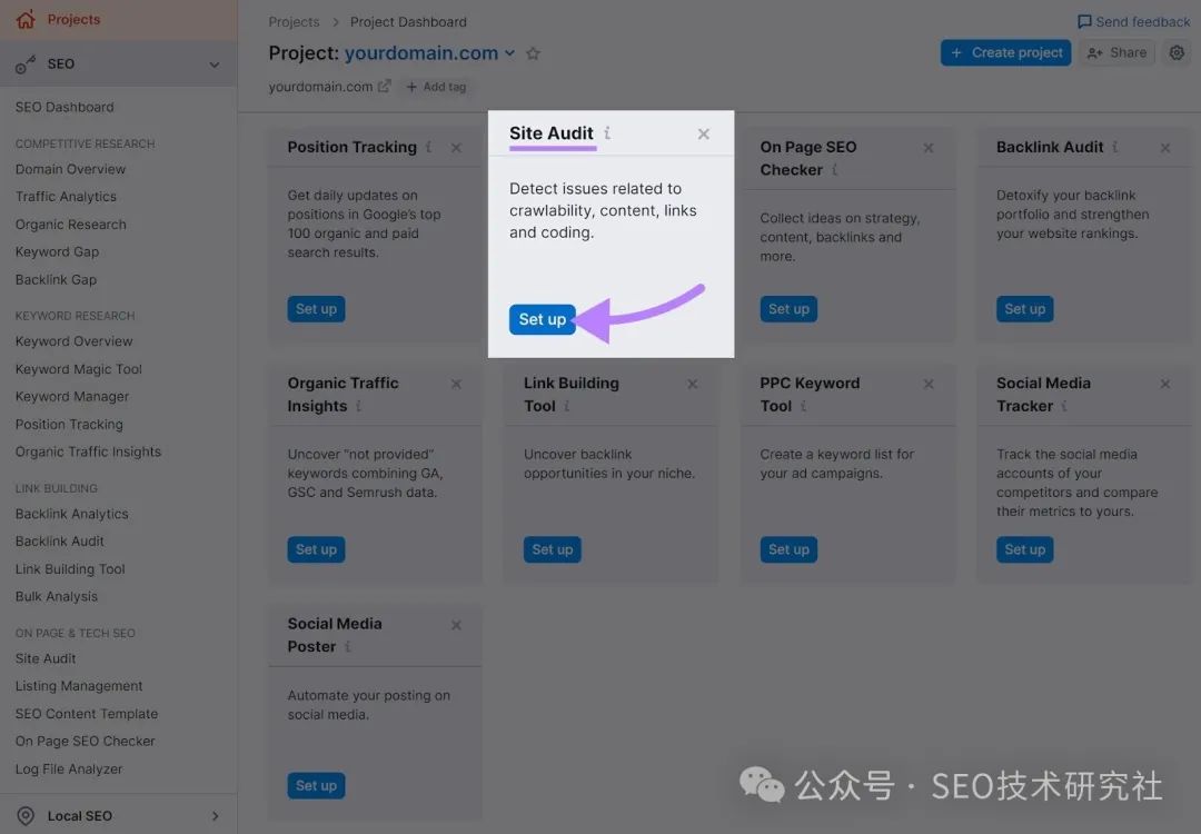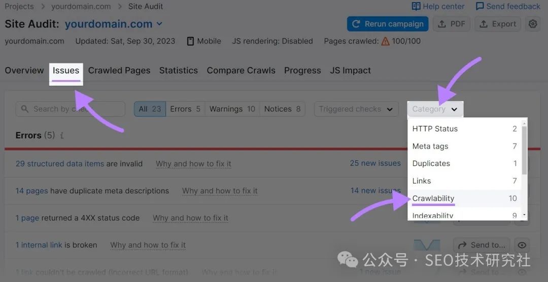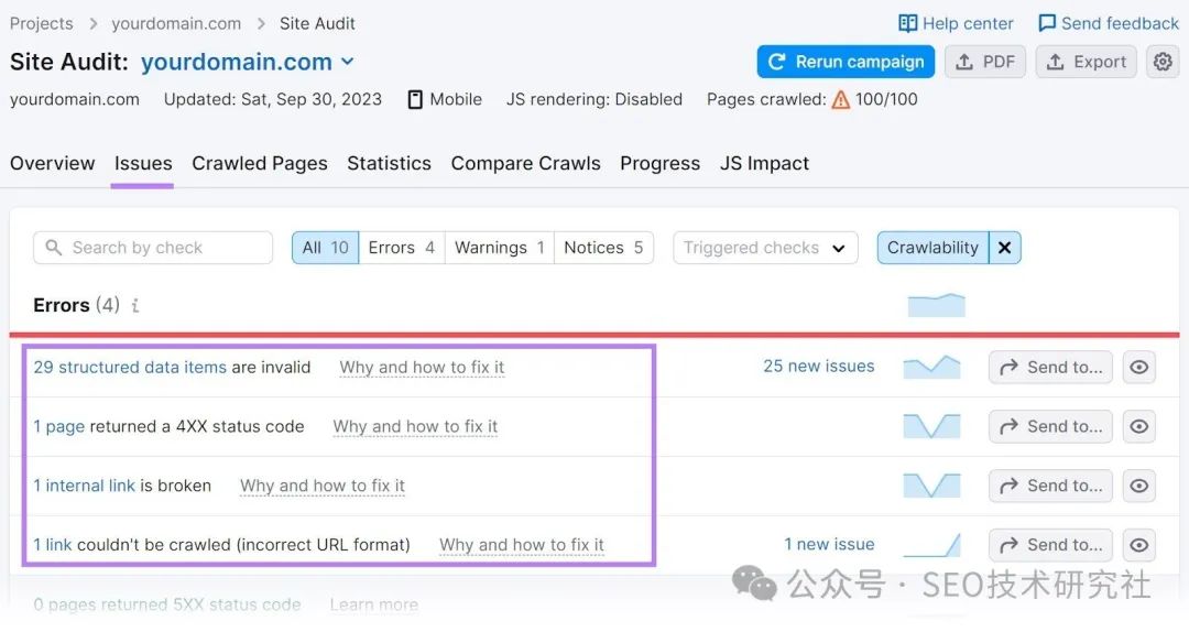 那么,你从哪里开始呢? 首先,勾勒出您网站所需页面的“骨架”。 例如,您可以从主页、关于页面、服务页面、联系页面和博客开始。 然后,每个都可以有子页面。 喜欢这个: ![]() 当您的网站启动并运行时,请运行快速审核,以确保不存在任何可抓取性问题。 首先,注册一个免费的 Semrush 帐户。 单击“我的项目”部分中的蓝色“+ 创建项目”按钮。 ![]() 然后,添加您的域,然后单击“创建项目”。 这样: ![]() 您将看到一个项目仪表板。找到Site Audit,然后单击“设置”。 ![]() 然后,选择要抓取的网页数,并将“网站”作为抓取源。 然后单击“开始网站诊断”。 喜欢这个: ![]() 现在,前往“问题”选项卡,然后从“类别”下拉菜单中选择“可抓取性”。 ![]() 您会看到网站的可抓取性错误、警告和通知列表。 ![]() 至少每月进行一次这样的审计。并解决出现的任何问题。 3. 设置 Google Search Console 和 Semrush 工具Google Search Console (GSC) 是一款免费的 Google 工具,可帮助您监控新网站的 SEO 效果并对其进行故障排除,尤其是在 Google 搜索中。 ![]() 要进行设置,请打开 Search Console,然后点击“立即开始”。 ![]() 在第一个屏幕上,选择“域”。然后,输入您的域名,然后单击“继续”。 ![]() 系统将提示您验证您的域名。请按照 Google 的分步说明执行此操作。 ![]() 完成验证后,您将能够使用 GSC 并查看您的分析。 (一开始看不到任何数据是正常的。特别是如果你的网站是全新的)。 ![]() GSC 可帮助您了解 Google 如何看待您的网站。以及您的网站在 Google 搜索结果中的显示方式。但它并不能提供您需要的所有数据。 例如,它提供了有关您排名的关键字和链接到您的网站的有限信息。 要查看全貌,您需要设置一个 SEO 平台。就像 Semrush 一样。 您将能够设置其他项目,包括: