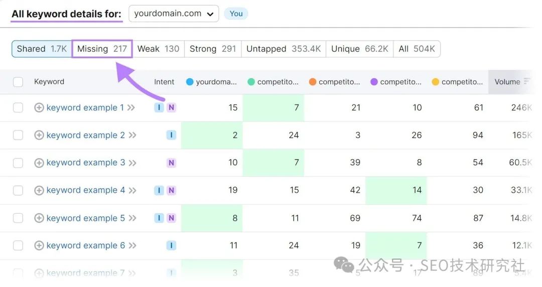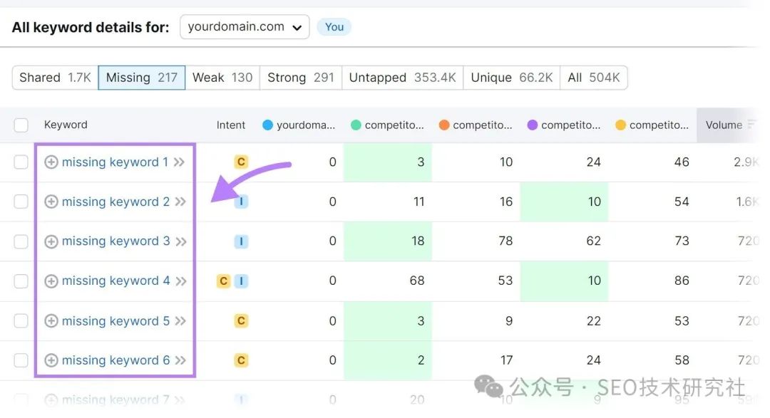首先,打开 Organic Research,输入您的域,然后单击“搜索”。 ![]() 然后,转到“竞争对手”选项卡并向下滚动以查看“自然竞争对手”表。 ![]() 这是您的顶级有机竞争对手的列表。 现在,您需要进行关键字差距分析,将自己与这些竞争对手进行比较。 关键词差距分析是寻找竞争对手排名的关键词的过程,但你没有。 每个“差距”都是您带来更多流量的机会。 首先,打开关键字差距工具。 然后,输入您的域名和最多四个竞争对手的域名。然后单击“比较”。 ![]() 向下滚动到表格,然后选择“缺失”。 ![]() 现在,该表仅显示所有四个竞争对手排名的关键字,但不显示您。 ![]() 这些关键字代表了您创建内容并填补这些空白的机会。 6.进行关键字研究关键词研究是识别、分析和选择关键词以优化你的内容以进行SEO的过程。 正确地进行关键词研究可以帮助你。