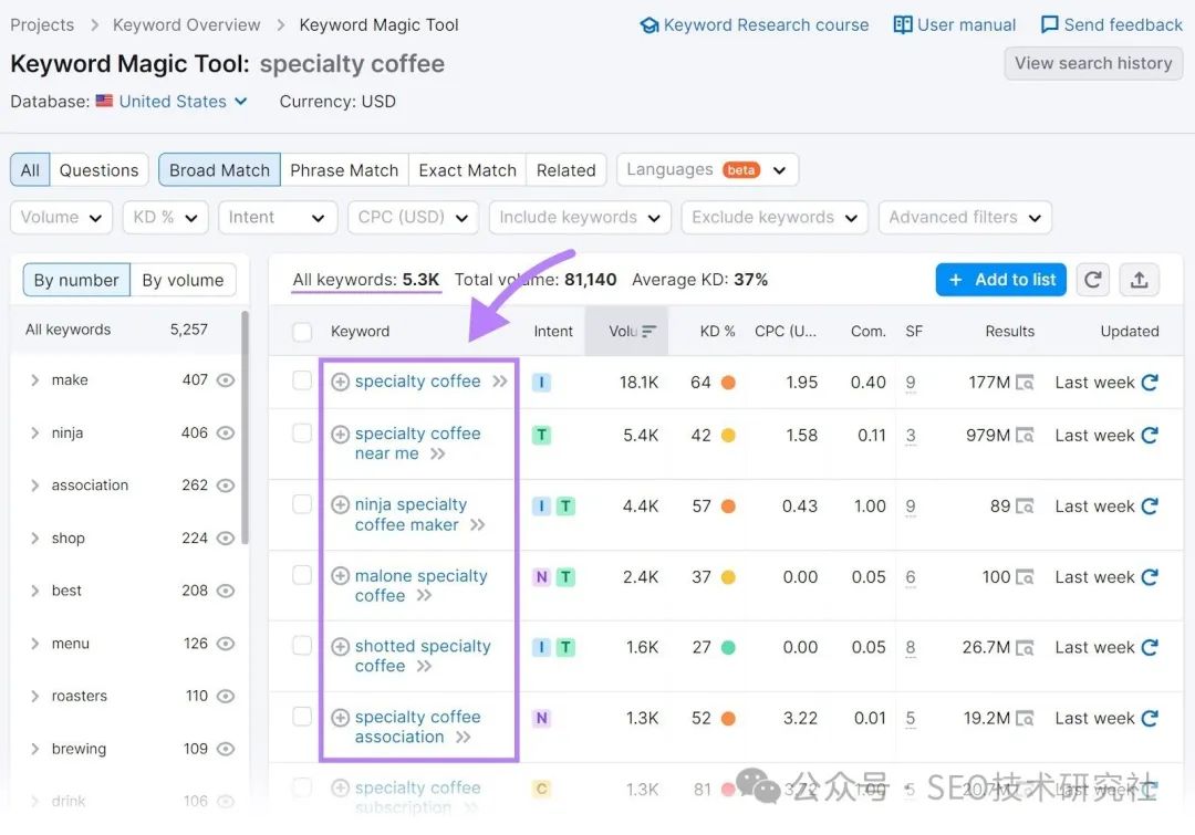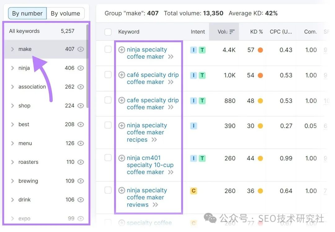 进行关键字差距分析是一个很好的起点。但是使用关键字研究工具会发现更多的想法。 前往关键字魔术工具,输入种子关键字,然后单击“开始”。 (种子关键字是你的利基市场中的一个广义术语。 ![]() 你会得到一个基于你的种子关键词的大量想法列表。 喜欢这个: ![]() 第一步将帮助您了解人们在搜索什么。并将关键字分组为主题和子主题。 例如,查看左侧的列。 您可以立即看到不同的组,例如“商店”、“菜单”、“食谱”、“评论”等。 ![]() 单击相关组以查找相关关键字。并使用您的利基市场中的其他种子关键字来执行此操作。 您将获得大量可以构建的页面、可以提供的服务以及可以创建的内容的想法。 7.创建针对SEO优化的内容当您开始一个新网站时,您有很多内容需要从头开始创建。SEO的优化至关重要。 方法如下: 搜索意图搜索意图是某人进行搜索查询的原因或动机。 搜索意图主要有四种类型:
