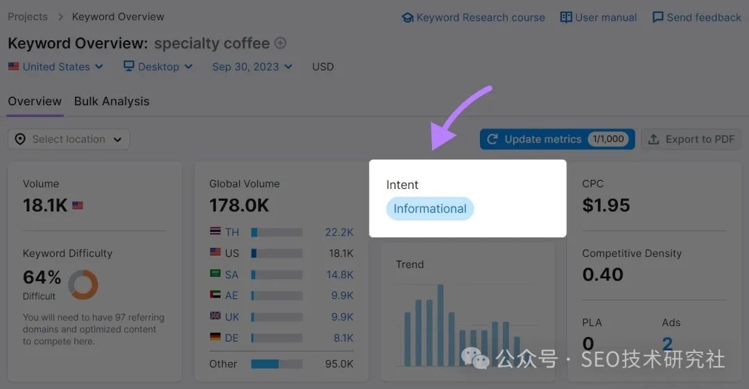 满足意图是谷歌的首要任务之一。 这意味着: 如果你想在谷歌上排名靠前,你需要了解意图。并创建与之匹配的内容。 例如,如果您定位的是具有交易搜索意图的关键字,则应创建一个页面,以便用户轻松购买。不要创建博客文章。 同样,如果您以具有信息意图的关键字为目标,请创建一篇有用且全面的博客文章。不是产品页面。 要快速找到任何关键字的意图,请通过关键字概览运行它。 您可以在标有“Intent”的小部件框中找到它的意图。 ![]() 针对页面搜索引擎优化页面搜索引擎优化是优化网页特定元素的过程,以便它可以排名更高并带来更多流量。 这很重要,因为搜索引擎在对页面进行排名时会考虑页面上的SEO信号。 一些页面SEO最佳实践包括。