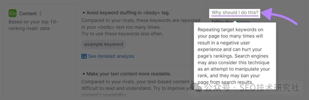 要快速优化您网站的页面搜索引擎优化,请通过页面搜索引擎优化检查器运行它。 选择或输入您的域名,然后单击“获取提示”。 ![]() 然后,您将看到一个仪表板,其中包含大量按类别方便分组的优化想法。 ![]() 单击“优化思路”选项卡。你会看到一个表格,里面有按优先级排序的想法。 喜欢这个: ![]() 此优先级基于优化想法的数量、页面的潜在流量以及实施这些想法的难易程度。 首先从优先级最高的页面开始。这些可能会产生最好的结果。 为此,请单击蓝色的“#想法”按钮。您将看到一个报告,其中包含该特定页面的所有想法。 ![]() 将鼠标悬停在“我为什么要这样做?”上,以了解有关该想法背后的原因的更多信息。 ![]() 努力实现该工具建议的想法。而且,您将提高最重要的页面排名更高的机会。 8.推广你的网站现在您已经创建了网站并对其进行了优化,是时候让人们知道了。人们不会神奇地自己来。 要开始推广您的网站,您可以: