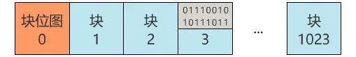 那我们给块 0 起个名字,叫块位图,之后这个块 0 就专门用来记录所有块的使用情况,不再用来存具体文件了。