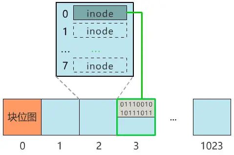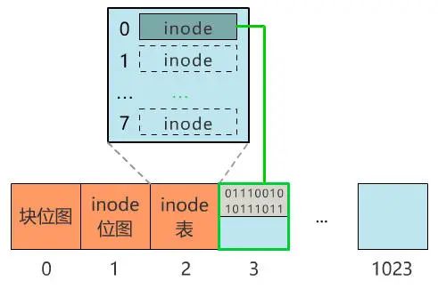 同时,我们把 inode 信息,放在 2 号块,一共存 8 条 inode,这样我们的 2 号块就叫做 inode 表