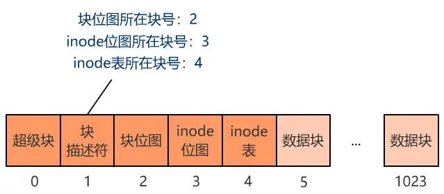 很简单,与超级块记录信息一样,这些信息也选择一个块来记录,就不怕了。那我们就选择紧跟在超级块后面的 1 号块来记录这些信息吧,并把它称之为块描述符