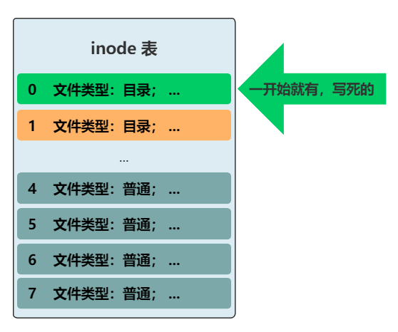 答案非常简单,我们规定,inode 表中的 0 号 inode,就表示根目录,一切的访问,就从这个根目录开始!