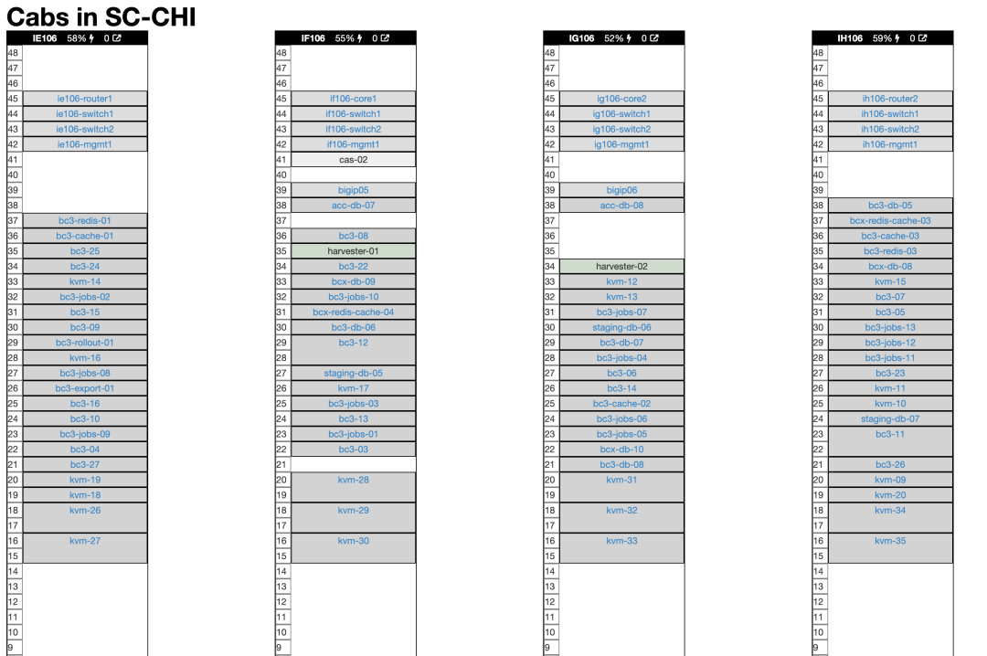 这是最近运抵我们芝加哥数据中心的两个托盘。同一天,一套同样的设备也到达了我们在弗吉尼亚州 Ashburn 的第二个数据中心。总的来说,我们收到了二十台R7625 Dell 服务器,是支撑我们的下云计划的主力。如此令人震惊的算力,占用的空间却惊人的小。 这是我们在芝加哥数据中心四个机柜的示意图(我们在 Ashburn 还有另外四个)。正如你所见,还有一堆专门给 Basecamp 用的老硬件。一旦我们装好新机器,大部分老服务器就该退役了。在下面带有 "kvm" 标记的2U服务器是新家伙: