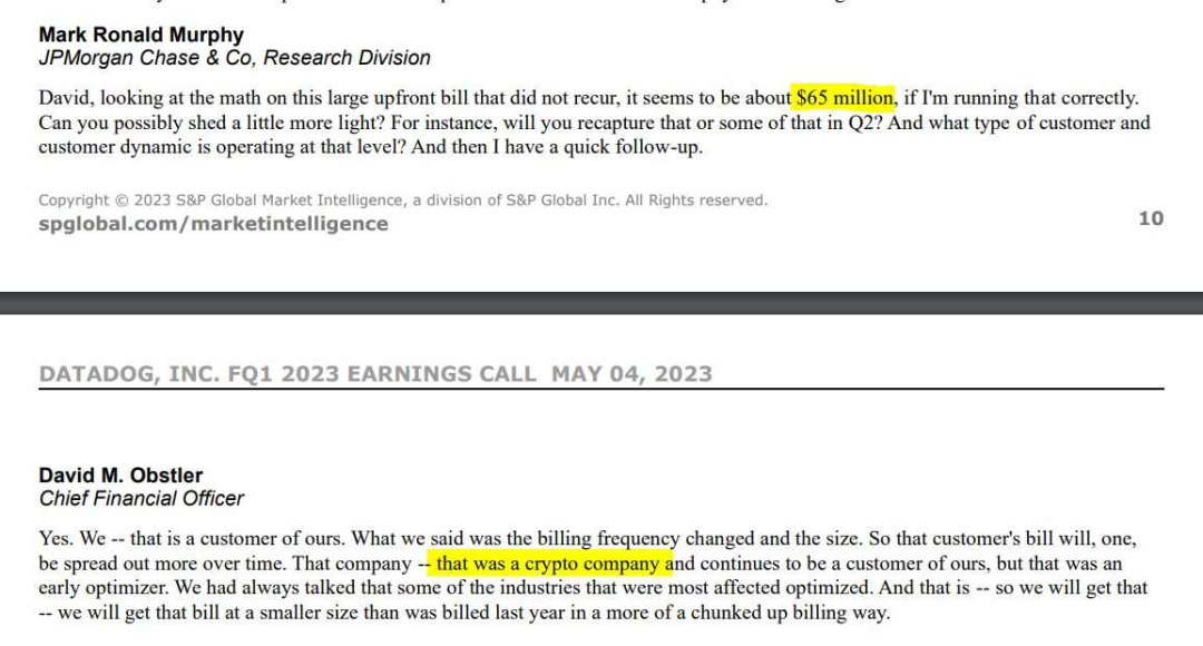 这个月底我们在 Datadog 上的年度订阅要到期了,我们不打算续费。 Datadog 是一个性能监控工具,倒不是因为我们不喜欢这项服务 —— 实际上它非常棒!我们不续订是因为它每年花费我们 88,000 美元,这实在是太离谱了。而且这反映出一个更大的问题:企业SaaS定价越来越愚蠢荒谬。 然而,我原本以为我们的账单已经够傻逼了。但是竟然有一个 Datadog 的客户为他们的服务支付了 6500 万美元!!这个信息是在他们最近的财报电话会议上提到的。这显然是一家加密货币公司,用“优化”账单的方式承认了这项蠢出天际的开支。