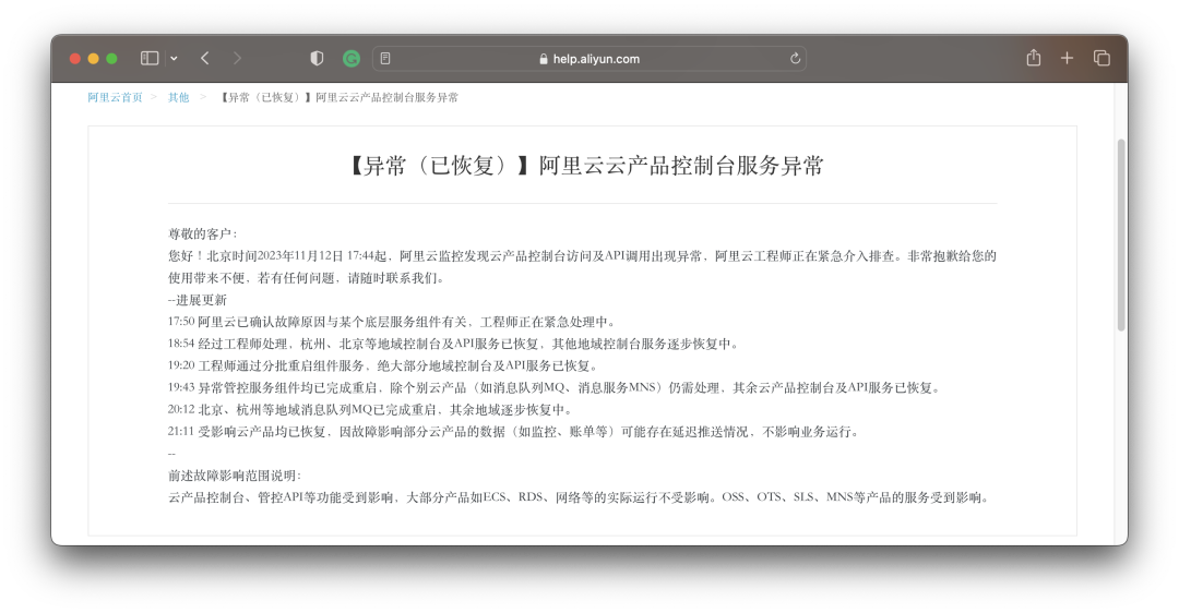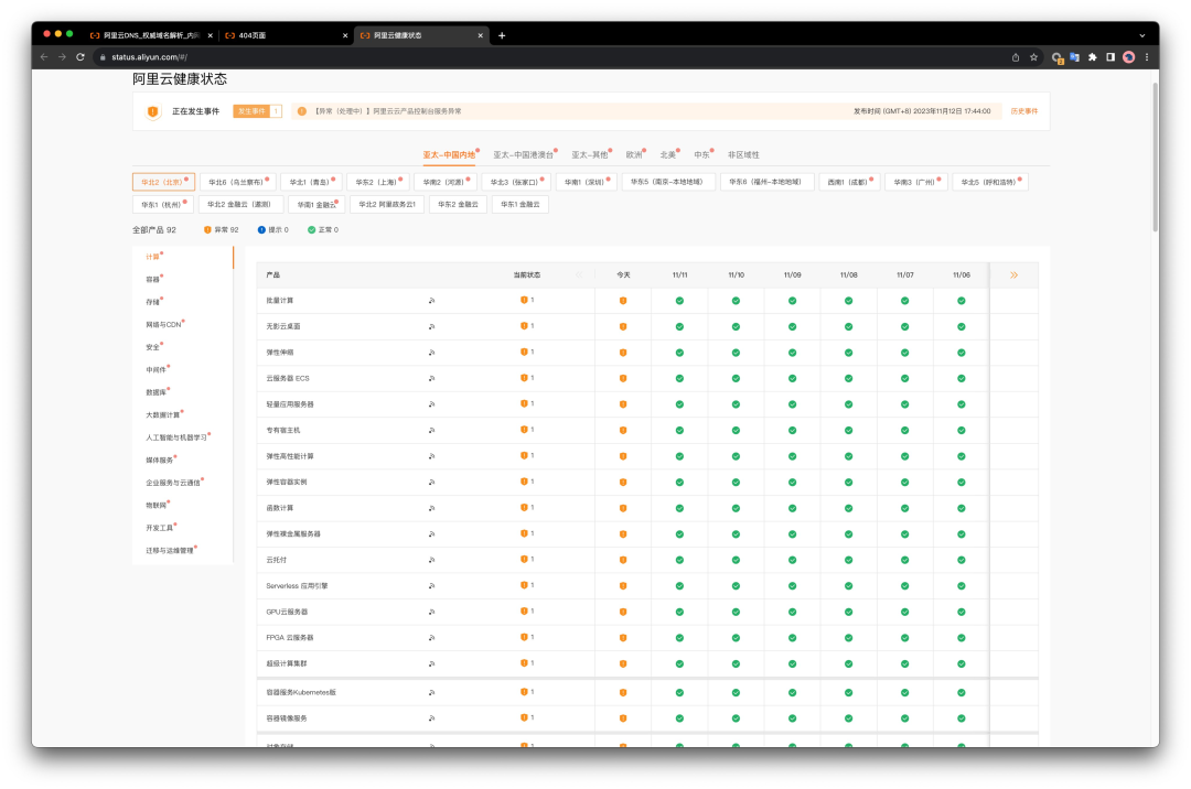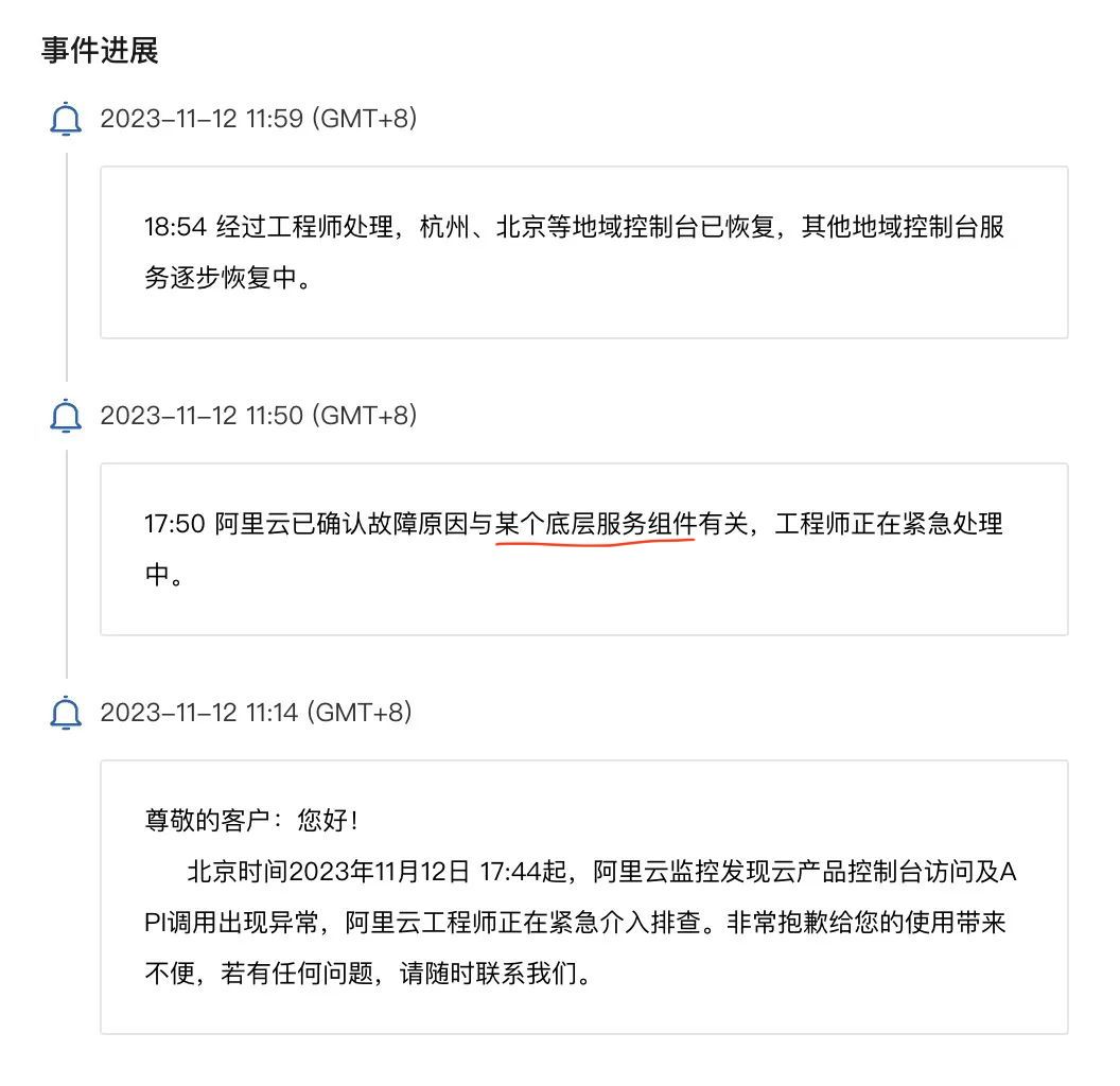 时隔一年阿里云又出大故障,并创造了云计算行业闻所未闻的新记录 —— 全球所有区域/所有服务同时异常。我们应当如何看待这一史诗级故障案例,以及,能从中学习到什么经验与教训?事实是什么?11月12日,也就是双十一后的第一天,阿里云发生了一场史诗级大翻车。根据阿里云官方的服务状态页[1],全球范围内所有可用区 x 所有服务全部都出现异常,时间从 17:44 到 21: 11,共计3小时16分钟。