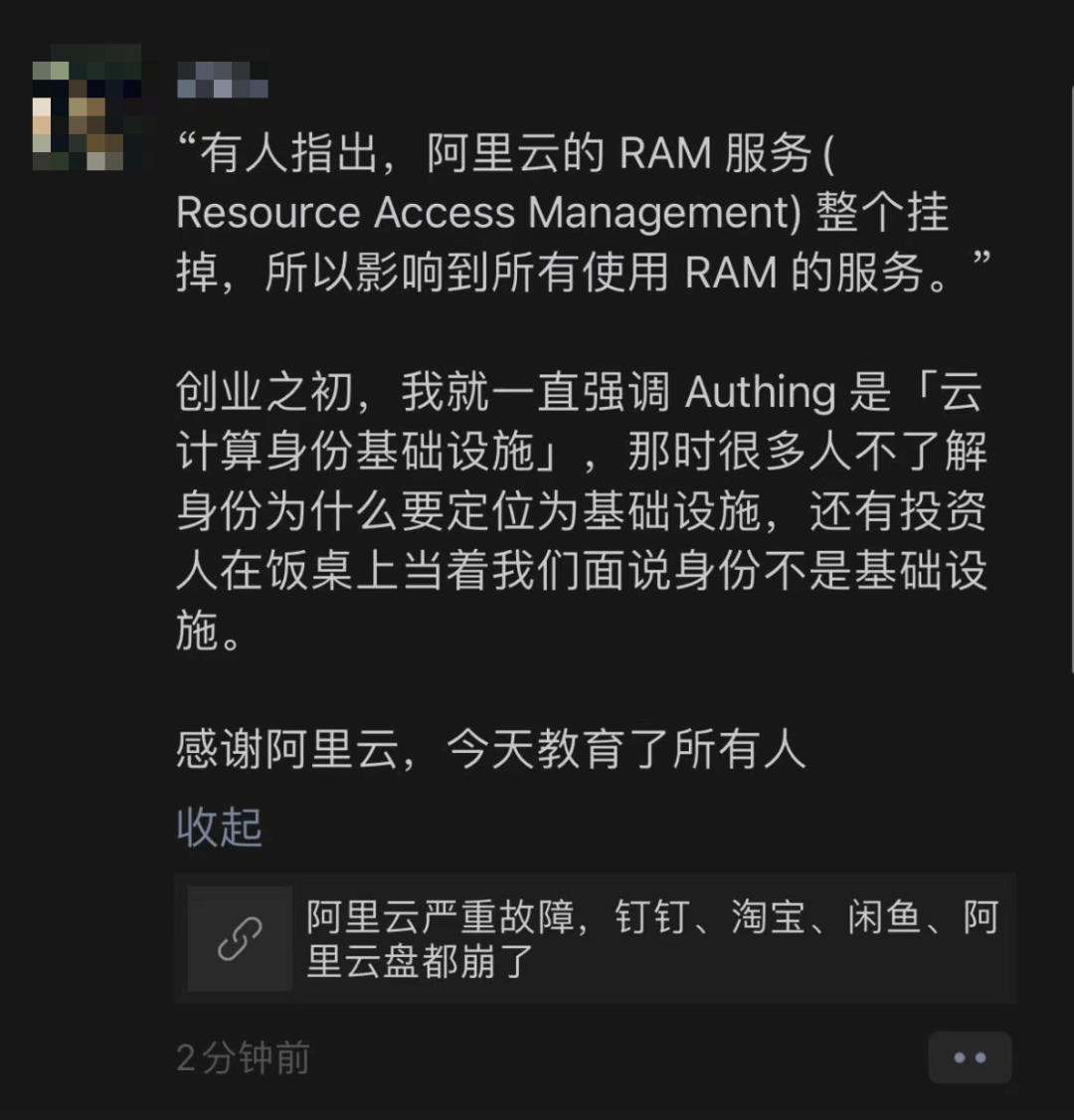 当然阿里云也可以主张说虽然 OSS / OTS 这些服务挂了,但他们的 ECS/RDS 只挂了管控面,不影响正在运行的服务所以不影响 SLA。说起来这种补偿即使是真的全部落地也没几个钱,更像是一种安抚性的姿态:毕竟和用户的业务损失比,赔个服务月消 25%代金券简直就是一种羞辱。 比起用户信任、技术声望以及商誉折损而言,赔的那点代金券真的算不上什么。这次事件如果处理不当,很有可能会成为公有云拐点级别的标志性事件。 评论与观点?马斯克的推特 X 和 DHH 的 37 Signal 通过下云省下了千万美元真金白银,创造了降本增效的“奇迹”,让下云开始成为一种潮流。云上的用户在对着账单犹豫着是否要下云,还没上云的用户更是内心纠结是否还要上去。在这样的背景下,作为本土云领导者的阿里云发生如此重大故障,对于犹豫观望者的信心无疑是沉重的打击。恐怕此次故障会成为公有云拐点级别的标志性事件。 阿里云一向以安全稳定高可用自居,上周还刚刚在云栖大会上吹极致稳定性之类的牛逼。但是无数层所谓的的灾备,多活,多中心,降级方案,被一次性全部击穿,打破了N个9神话。如此大范围、长时间、影响面如此广的故障,更是创下了云计算行业的历史记录。包括金融云和政务云在内(是否是私有化部署的版本?)也同样出现了服务不可用。 阿里云全球故障揭示出出关键基础设施的巨大风险:完全依托于公有云厂商的大量 Web 服务缺乏基本的自主可控性:在故障发生时除了等死做不了别的事情。同时也展现了垄断中心化基础设施的脆弱性:互联网。这个去中心化的世界奇迹现在主要是在少数几个大公司/云厂商拥有的计算机上运行。如果 AWS 的主要区域之一出现故障,几乎一半的互联网都会随之下线。某个云厂商本身成为了最大的业务单点,这可不是互联网设计的初衷! 而这次更为严峻的挑战恐怕还在后面,来自全球用户的追索赔钱事还小,真正要命的是在各个国家都在强调数据主权的时候,如果因为在中国境内的某个控制中心配置失当导致全球故障的话,(即:你真的卡了别人的脖子)我相信很多海外客户会立即采取行动,迁移到别的云供应商上:这关乎合规,与可用性无关。 去年十二月阿里云香港机房的故障已经暴露出来了许多的问题,然而一年后没有不见改进反而来了一个更大的惊喜。这样的事故对于阿里云的品牌形象绝对是致命打击,往大了说,像这样的故障对整个行业的声誉都有严重的损害。阿里云应该尽快给用户一个解释与交代,发布详细的故障复盘报告,讲清楚后续改进措施,挽回声誉与用户的信任。