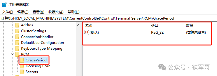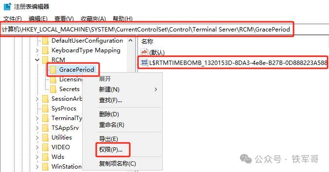 然后找到GracePeriod注册表,这个键值与远程桌面服务的授权有关,特别作用于存储某种类型的宽限期信息。