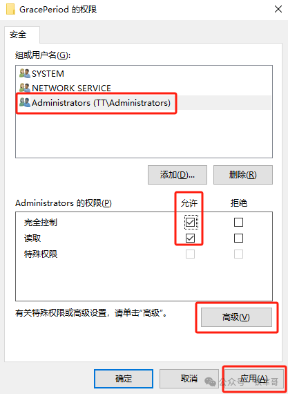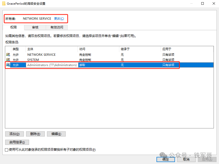 可以看到,现在该注册表项的所有者是NETWORK SERVICE,而Administrators用户组只有读取权限,无法修改。所以只要将所有者变更为Administrators用户组就好了。