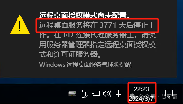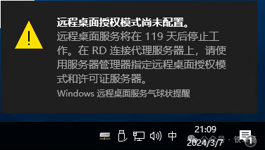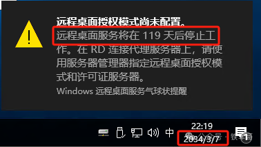 我们前面介绍了如何实现Windows Server的多用户登录(Windows Server调整策略实现999999个远程用户用时登录),但是有一个实用性的问题,那就是只有119天的临时授权。比如我现在登录时,就会冒泡提醒我,“远程桌面服务将在65天后停止工作”。