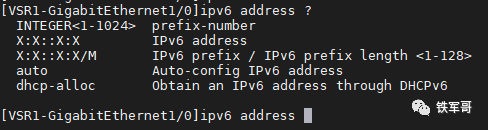 这里就提到了手工配置IPv6地址,从上图中可以看到,地址前缀的表示方式为:IPv6地址/前缀长度。其中,前缀长度是一个十进制数(取值范围为1-128),表示IPv6地址最左边多少位为地址前缀。
