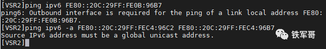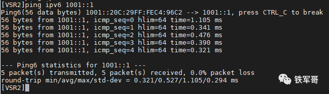 好了,到这里你应该已经熟练掌握了IPv6地址的基本知识点,我们最后测试一下VSR1和VSR2的通信吧。