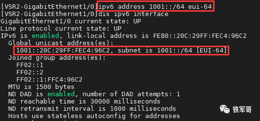 手工配置IPv6地址的另一种方式是采用EUI-64格式,这也算是一种半自动的方式,其中接口的IPv6地址的前缀需要手工配置,而接口ID则由接口自动生成。
