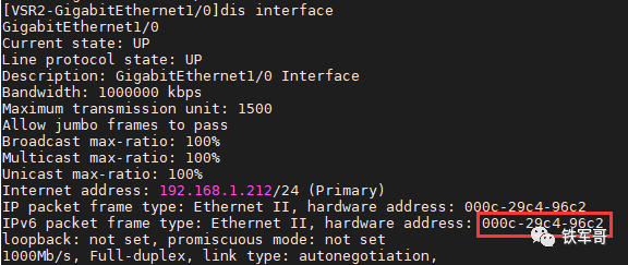 查看一下接口的MAC地址,可以发现采用EUI-64格式生成的IPv6地址的后6位和MAC地址是一致的,具体算法就不可得知了。但是接口ID由MAC地址产生,并且接口ID始终不变,这就存在了一定的安全隐患。