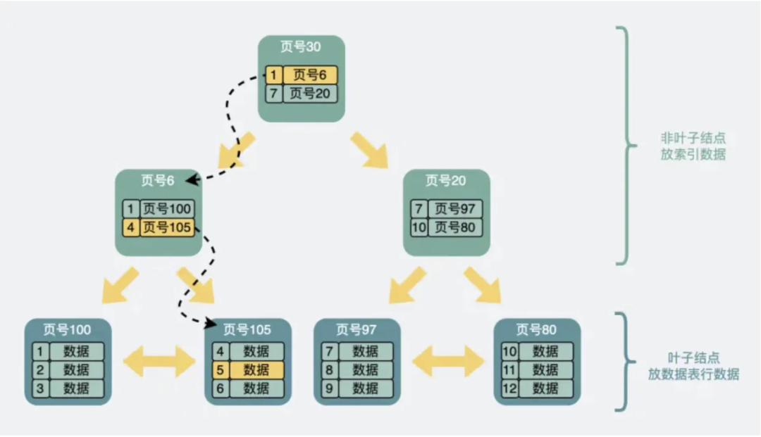 数据是以数据页的形式进行存储,数据页和数据页之间是以B+树的形式进行关联,例如: