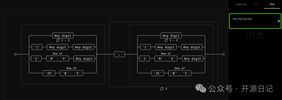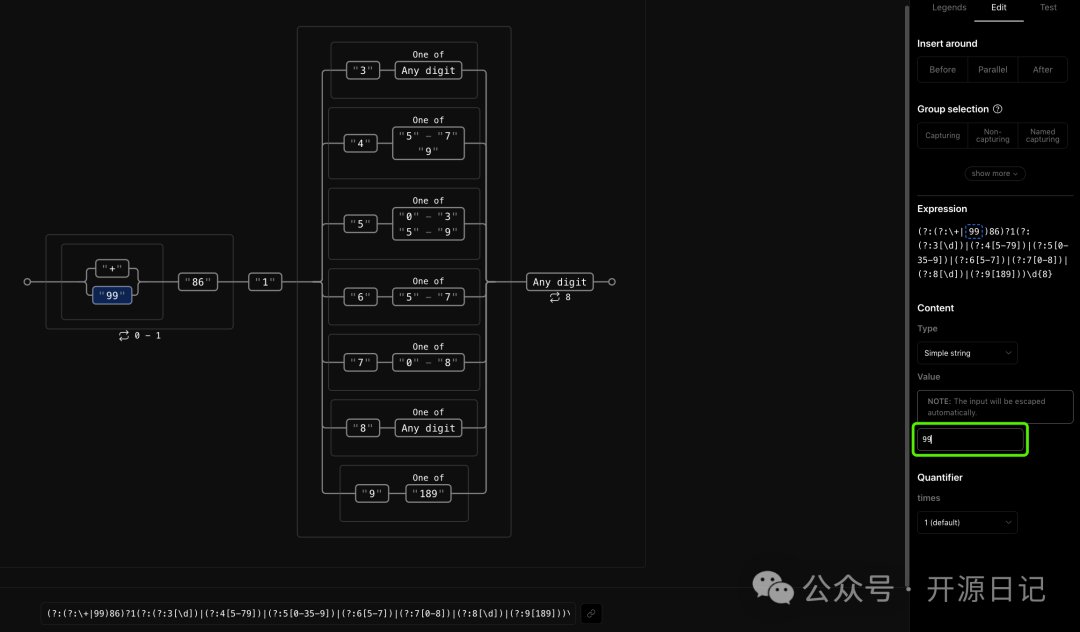 除了可视化展示外,regex-vis 还提供了强大的编辑功能,使用户能够在界面上直接编辑正则表达式。用户可以实时查看编辑后的效果,从而快速调试和优化自己的正则表达式。