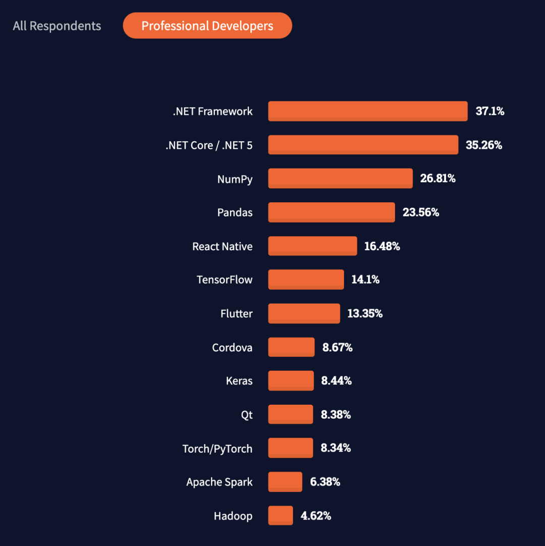 众所周知,.NET 是企业的中流砥竿,虽然微软没有公开发布.NET 的采用情况,但有 95% 的财富 500 强企业都在使用 Azure。而且,我私下里也被告知,至少 80% 的财富 500 强企业在使用.NET,但实际数字可能更高,因为遥测技术经常会被关闭。