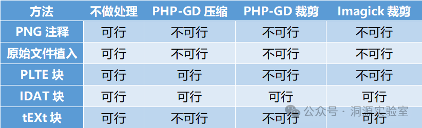 使用Imagick进行图片处理的时候(比如thumbnailImage函数或resizeImage函数),看起来可以使用应对PHP-GD的方法来解决,比如PNG图片的注释或者PLTE块植入PHP代码。