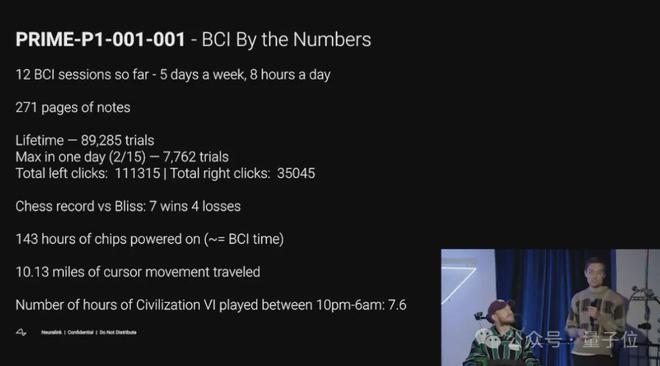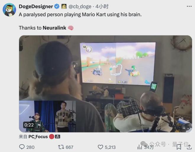 马斯克脑机接口公司的首位志愿者,又给我们展现了一段“绝活”: 肩部以下全无知觉的他,只靠脑中的一块芯片,就打起了马里奥赛车游戏。 只见赛车前进、转弯,控制得相当灵活。 小哥全程也玩得相当投入,甚至还击败了正常人类玩家。 啧啧,四肢瘫痪者,用意念打赛车游戏。 这不是未来是什么 有网友看完则开玩笑称: 任天堂这次就别出击了吧(律师函警告)。人家玩得多享受啊。 首次公开实验细节 以上片段来自Neuralink内部的一场公司会议。 首位志愿者兼“形象代言人”Noland Arbaugh(我们姑且叫他“阿堡”)作为vvip嘉宾出席。 阿堡今年29岁,国际象棋退役棋手,8年前在一次潜水事故中不幸瘫痪。 说来巧妙,他成为Neuralink脑机接口实验志愿者是靠朋友的一个醉酒电话。 六个月前,这位热心的朋友在酒后打电话告诉阿堡: Neuralink正在招募人体试验志愿者,他才第一次听说Neuralink。 申请表也由朋友帮他代填,嗯,名字还给拼错了。 今年1月,顺利成为志愿者的阿堡接受了手术,并表示很轻松: 手术很简单,我原本预计康复时间会很长,但第二天就被“赶”出了医院。术后也没有出现什么认知障碍。 几天前的直播中,他向网友展示了如何利用自己的意念移动光标下国际象棋(包括用意念暂停直播中的背景音乐)。 这次和父亲一起玩马里奥赛车,自然也不在话下了。 (咳咳,扮演的还是重要角色Bowser) 据介绍,阿堡本身悟性非常够快。 他在开始“使用”脑机接口芯片后七个小时,就打破了光标控制学习任务的计时记录。 当然,以上各种“轻松”的表现,其实建立在阿堡和Neuralink团队已经无数次的试验和努力之上。 Neuralink介绍,整个2月份他们一共召开了12次脑机接口会诊。 保持每周5天、每天8小时的工作量。 阿堡到目前为止一共完成了89285个目标,光是2月15号那天就达成了7762个。 他的表现也为Neuralink产生了271页的宝贵数据(一度超出了谷歌文档的上限,不得不分开记录) △阿堡在内部代号为P1 阿堡收获的战绩也不错,包括: